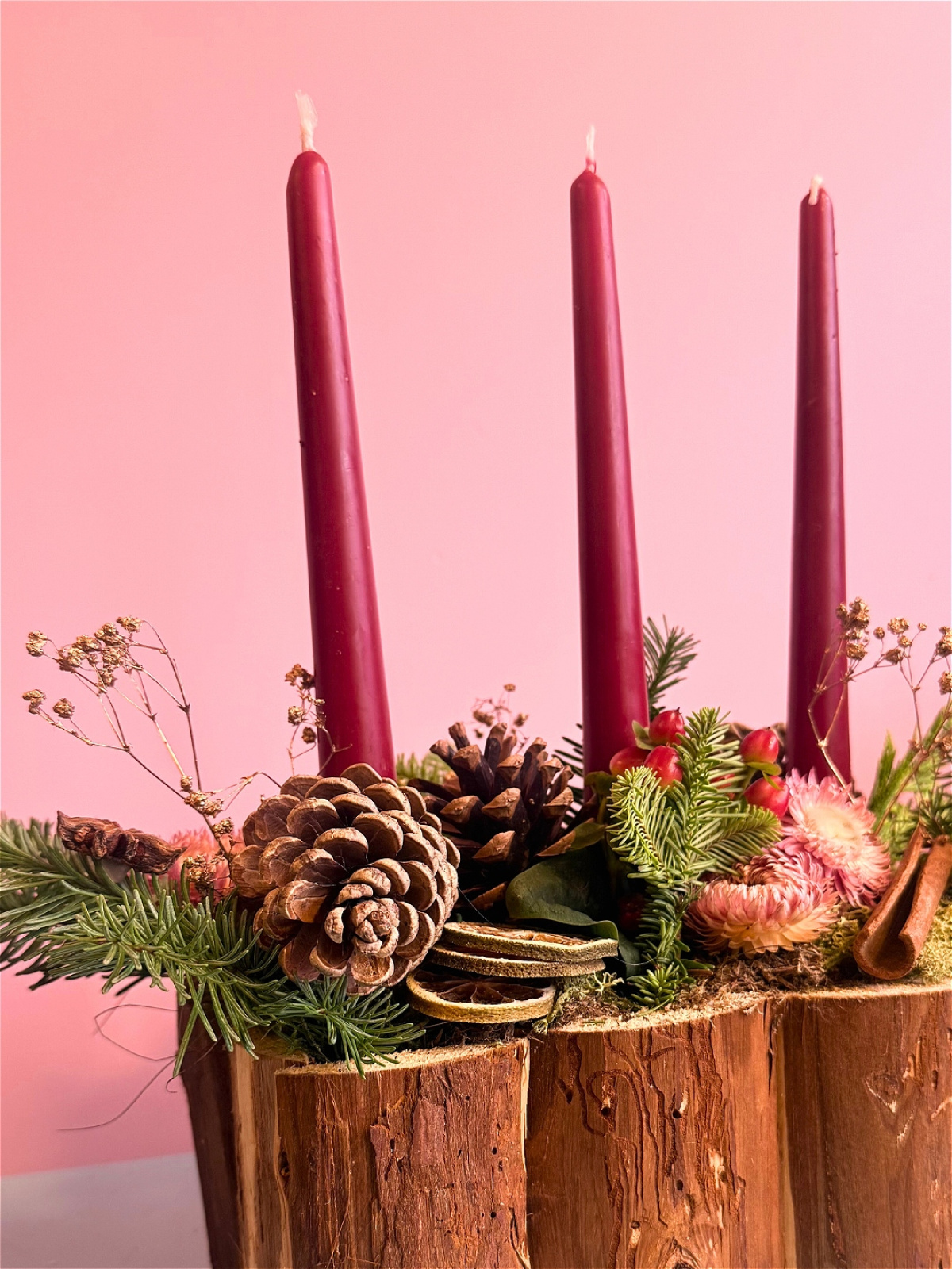 Natural advent style centrepiece designed in a bark base with three deep red (or white) taper candles. Packed with winter greenery pine cones dried fruits and seasonal stems. A beautiful alternative to a traditional wreath and perfect for dining tables.